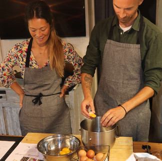 Nathalie och Patrik bjöd oss på en matlagningskurs till en före detta Michelinrestaurang som var familjeägt där frun och hennes föräldrar tog emot oss. Vi fick prova på att laga egentillverkad pasta med olika tillbehör bland annat rullade spenatbollar och mycket mer, tilltugg med friterade fläderblommor, väldigt gott och förstås bjöds det på olika viner. Desserten bestod av en sorts kladdchokladkaka med varma jordgubbar, allt detta hjälptes vi åt att laga, härlig stämning hela tiden. Det fanns andra med i gänget nämligen ett nygift par på en lång bröllopsresa, de kom från Nya Zeeland. Hela dagen var väldigt uppskattad av oss. Mycket bra ordnat, Nathalie och Patrik!