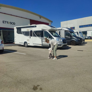 När vi väl stannar på campingar brukar vi spana in vad de andra rullar in med. Här har vi t.ex. ett par campare som valt att ta med sig en egengräsmatta på släp, i tillägg till sin "husbuss".