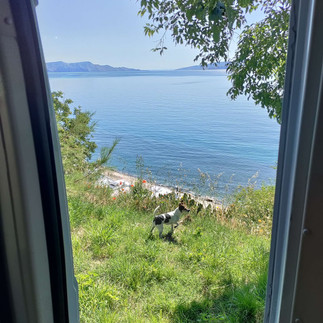 Lockelsen följer för stor iallafall en gång under dagens färd, så det blev ett stopp på en parkering längst vägen framför resturangen/hotellet Rooms Florida i byn Trinanj. Den troliga ägaren kom ut precis när jag dragit i handbromsen och berättade för oss hur vi skulle parkera samtidigt som hon sa att detta var restaurangens parkering, med en tydlig underton att här måste vi spendera pengar.